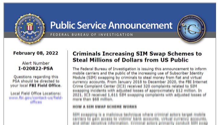 美国联邦调查局(FBI)表示,2021年整年,他们收到了1611起与 SIM卡交换的投诉,调整后的损失超过6800万美元。相比之下,该机构从2018年到2020年收到了320起与 SIM卡交换事件有关的投诉,调整后的损失约为1200万美元。